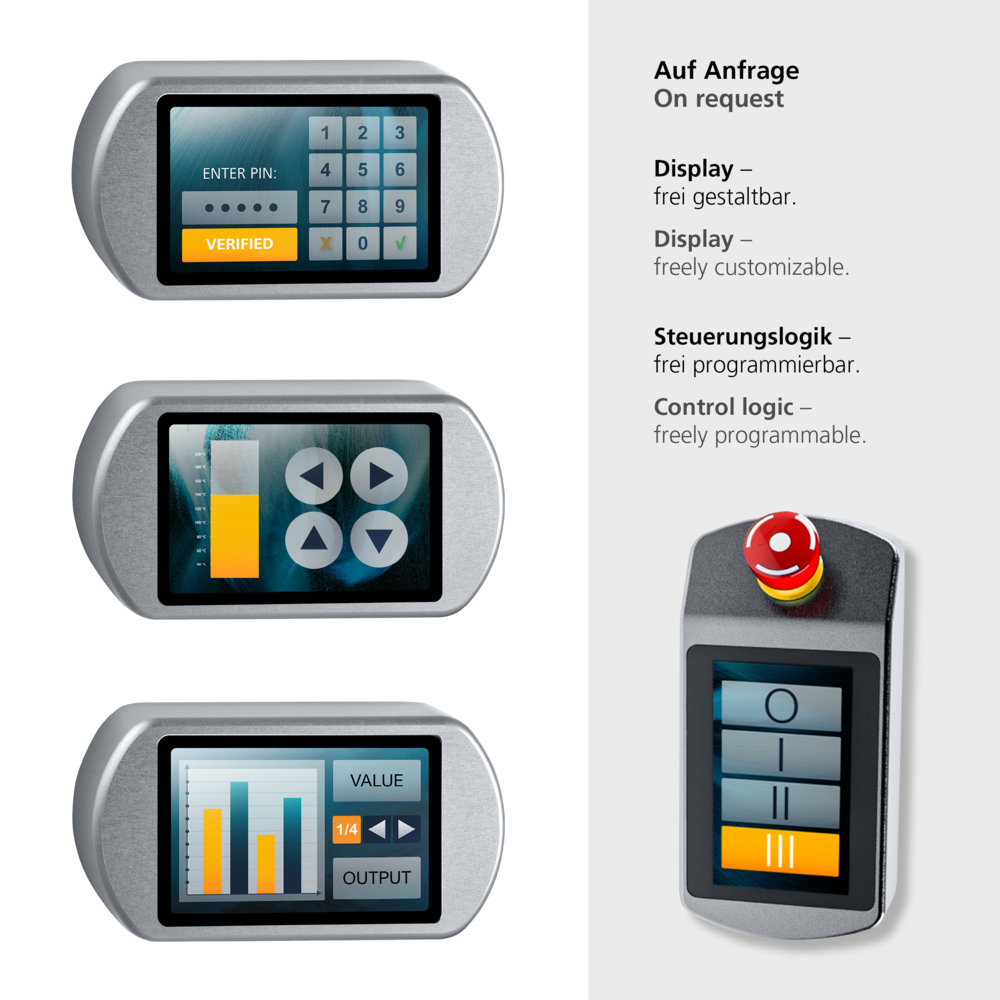 Control unit with modern touch screen HMI solution for operating or monitoring e.g. machines or systems. Standard user interface or customised user interface selectable. Complete plug & play ready solution for your requirements.