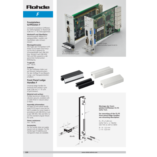 All types of front panel handle strips F2-F5 have a cross slot for M2,5 suitable for screw heads in accordance with DIN 933 or nuts as per DIN 935, 562 and 934, to suit the standard angular fixture for cards.