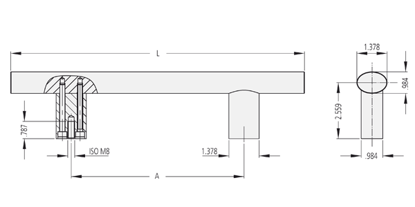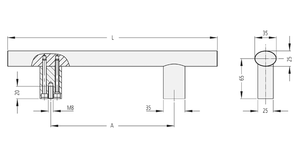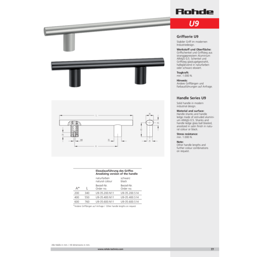 Handle shanks and handle ledge of extruded aluminium AlMgSi 0,5. Shanks and handle ledge glass ball blasted, anodized in satin finish in natural colour or black.