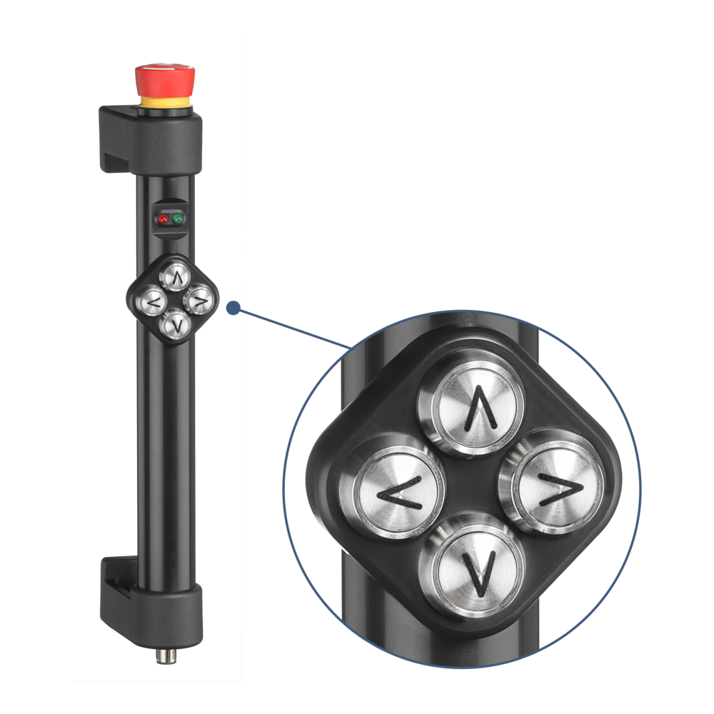 Emergency stop (2 NC contacts), 2 status LEDs and 4 push buttons (NO contact) as a control pad.
