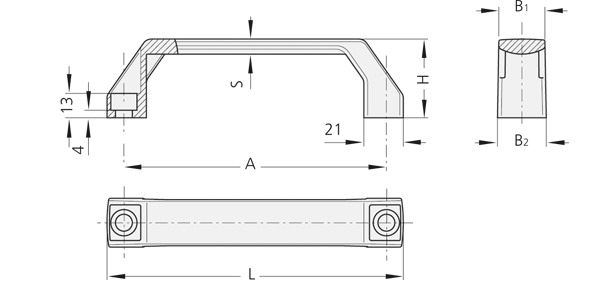 Hard component made of black heavy duty polyamide PA 6, glass ball reinforced, matt with fine structure. Soft component made of SEBS, basalt grey RAL 7012.