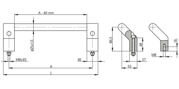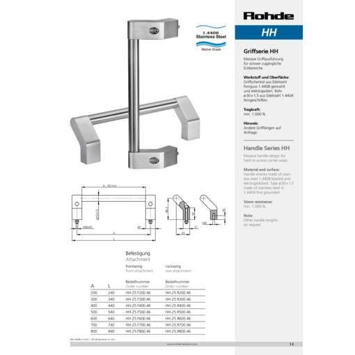 Handle shanks made of stainless steel 1.4408 blasted and electropolished. Tube ø30×1.5 made of stainless steel in 1.4404 fine ground.