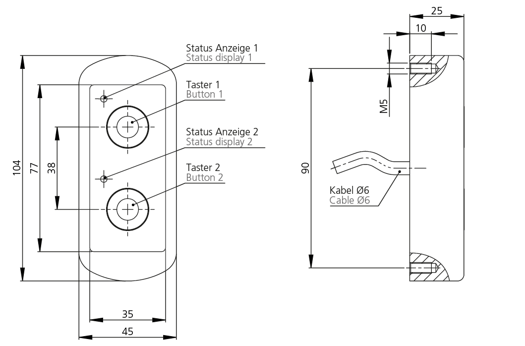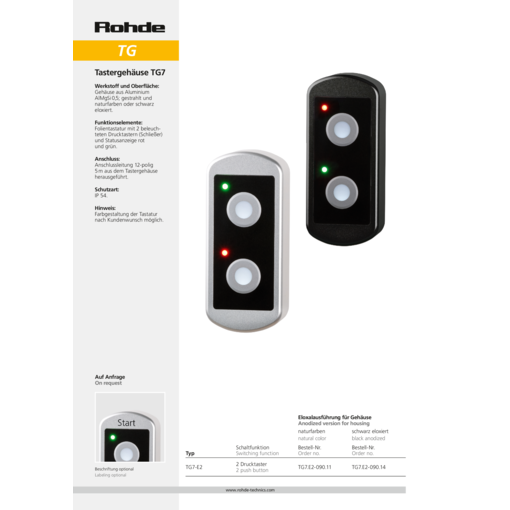 Membrane keypad with 2 illuminated push-buttons (NO contact) and status display red or green.