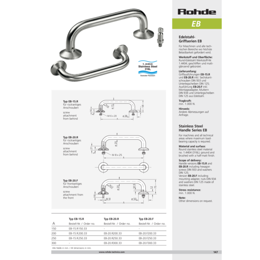 Modelos de asas EB-15.R y EB-20.R incluye tornillos DIN 933 y Arandelas DIN 125; modelo de asas EB-20.F incluye adaptador de montaje, tuercas DIN 934 y arandelas DIN 125.