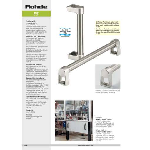 Unión de los soportes laterales del asa es impermeable a salpicaduras de agua. Fijación adicional de tubo del asa con tornillo prisionero con hexágono interior. Existe la posibilidad de atornillar el asa por su parte frontal o posterior. Fácil de limpiar.