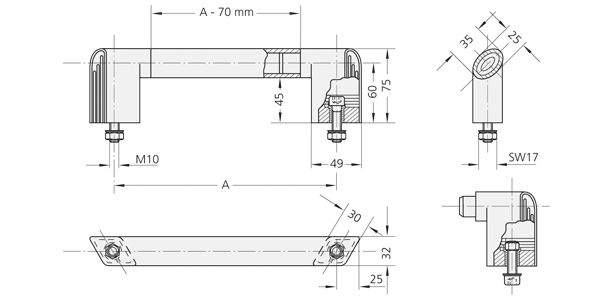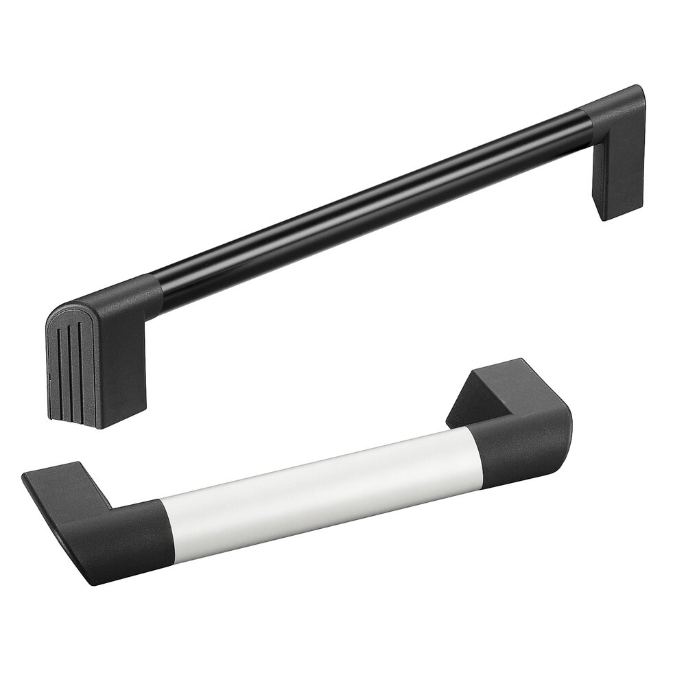Soportes laterales del asa de poliamida PA6 antracita, semi mate. Tubo del asa de tubo de perfil ovalado de aluminio, anodizado en color natural o recubierto con plástico antracita.