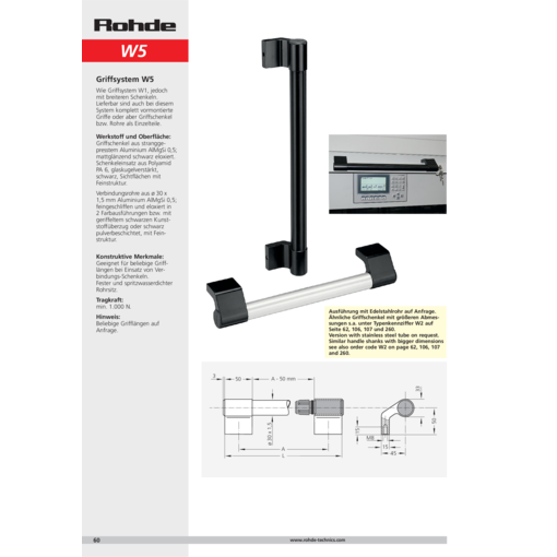 Los soportes laterales del asa son de aluminio extruido AlMgSi 0,5, brillo mate anodizado en negro. Inserto de de los soportes laterales es de poliamida PA6, reforzado con fibra de vidrio, negro, áreas visibles con textura fina. Tubo del asa de tubo de perfil ø30x1,5 mm aluminio AlMgSi 0,5, pulido y anodizado en 2 colores o bien recubierto con plástico negro acanalado o pintado con polvo negro, con textura fina. Opcionalmente disponible también en acero, cromado en brillo mate.