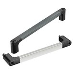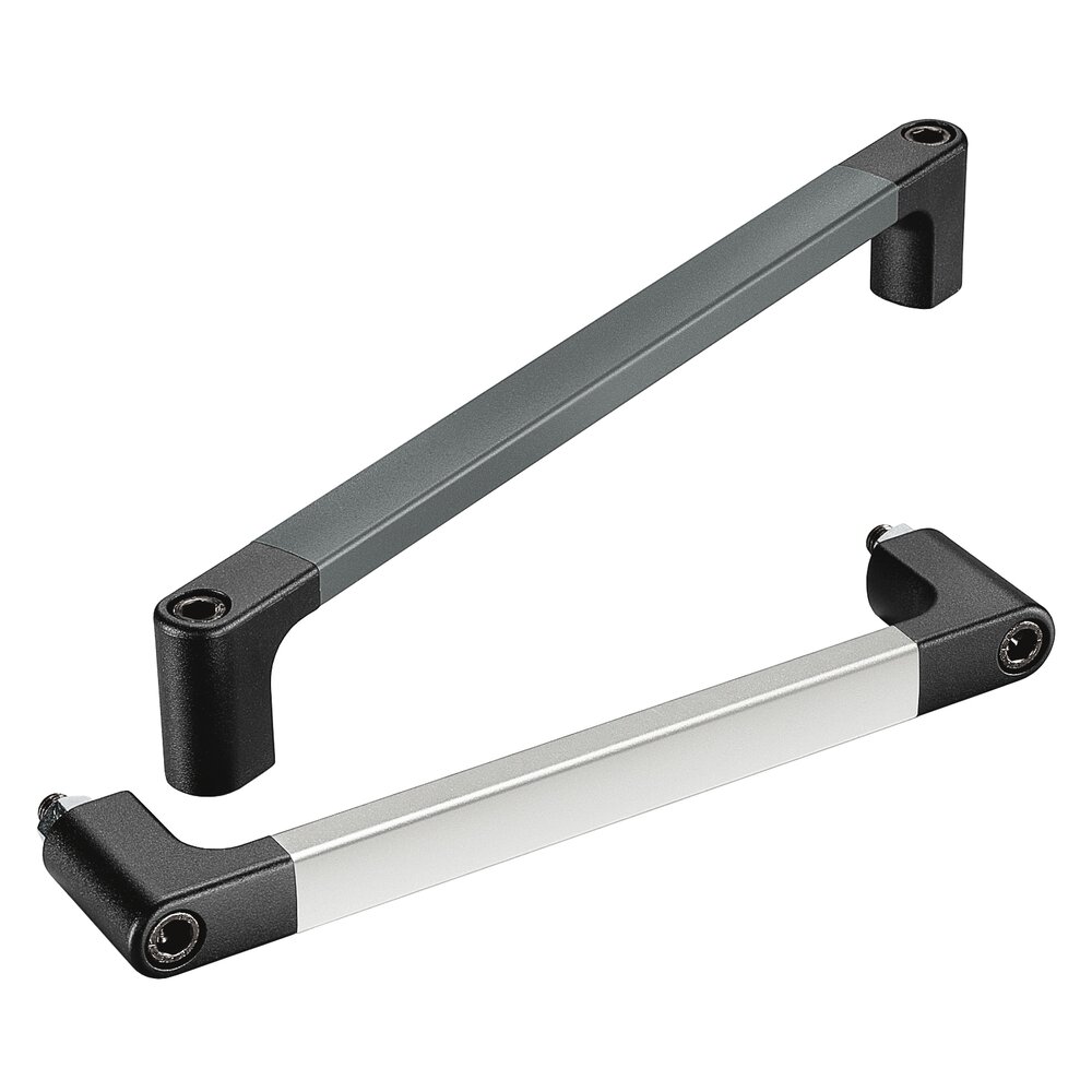 Los soportes laterales del asa pintados de polvo negro, semimate; el tubo del asa de aluminio anodizada en color natural, brillo mate o pintado de polvo gris, similar RAL 7043.