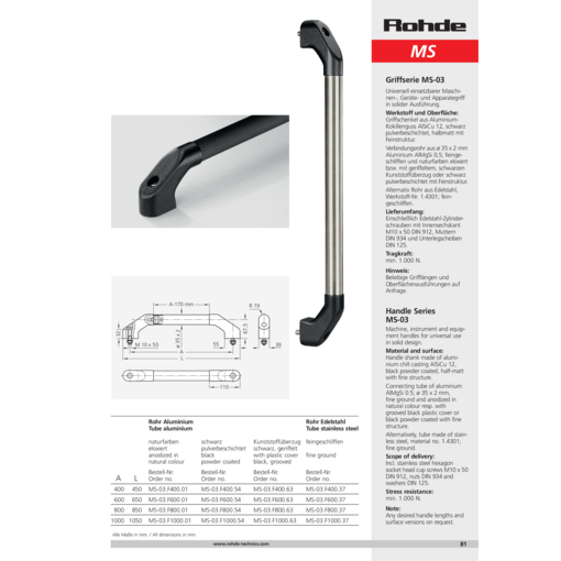 Soportes laterales de asa de fundición de aluminio en coquilla AlSiCu 12, pintados con polvo negro, semimate con textura fina. Tubo del asa de tubo de perfil de ø35x2 mm de Aluminio AlMgSi 0,5, pulido, anodizado en color natural o bien cubierto con un revestimiento acanalado de plástico negro o pintado con polvo negro con textura fina. Opcionalmente el tubo del asa puede ser de acero inoxidable, Material Nro. 1.4301, pulido.
