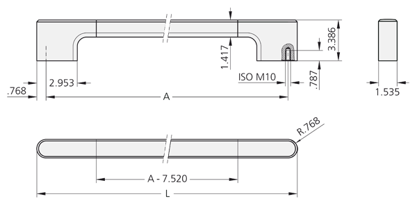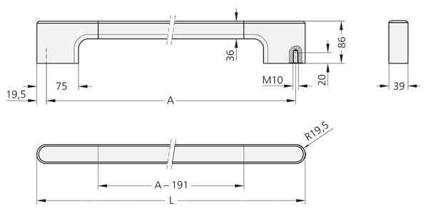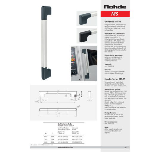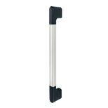 Soportes laterales del asa de de fundición de aluminio en coquilla AlSiCu12, pintado con polvo gris antracita (similar a RAL 7016) o negro (similar a RAL 9005), semi-mate. Tubo del asa de tubo de perfil de aluminio extruido AlMgSi 0,5; de acabado granular y anodizado en colores naturales.