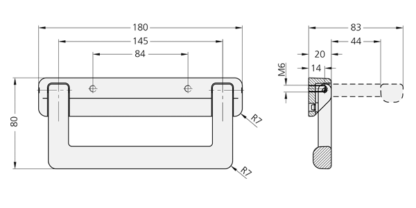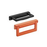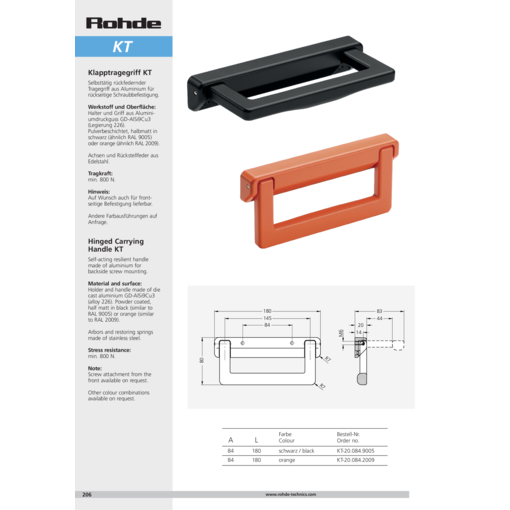 Soporte del asa y asa de fundición de aluminio GD-AlSi9Cu3 (aleación 226). Recubierto por polvo de color negro (similar a RAL 9005) o naranja (similar a RAL 2009), semi mate. Ejes del asa y resorte de reposición de acero inoxidable.
