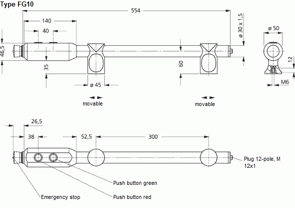 2 pulsadores hasta 1A con anillo de iluminación en rojo o verde. Otros colores LED bajo pedido. Tipo FG10-05 adicionalmente con interruptor de parada de emergencia.