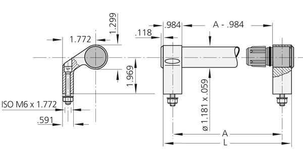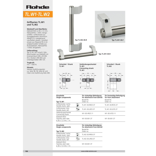 Type de poignée TL.W1-30.F incluant des vis six pans creux cylindriques M6×45 DIN 912 en acier inoxydable, écrous DIN 934 et rondelles DIN 125.