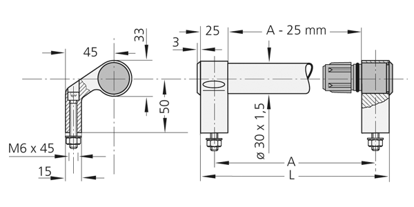 Tube en acier inoxydable ø30×1,5 mm, matériau Nr. 1.4301, poncé. Fixations en aluminium extrudé AlMgSi 0,5, surface opale satinée, anodisée naturel. Tige de fixation en polyamide PA6 avec disque en acier inoxydable, matériau Nr. 1.4305, surface finement tournée.
