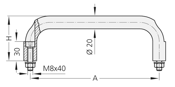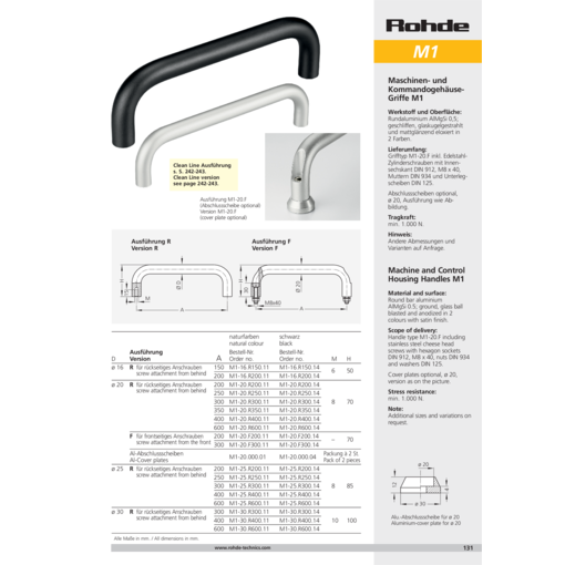 ハンドルタイプM1-20.F、ステンレススチール製シリンダーアレンボルトDIN 912、 M8x40、ナットDIN 934及びワッシャーDIN 125を含む。 エンドディスクはオプション、リ20、仕様は 図参照。