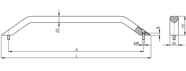 ハンドルタイプMV-32.F、ISO 7380に準拠した六角穴付ステンレス鋼ねじM8x25付。