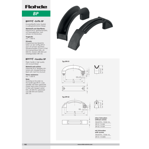 記載商品番号に対応して ハンドルタイプBP-01は黒電 気メッキ加工シリンダーボルト、アレンキーM6x20 DIN 912、ナット DIN 934及びワッシャーDIN 125付きでも納品可能です。