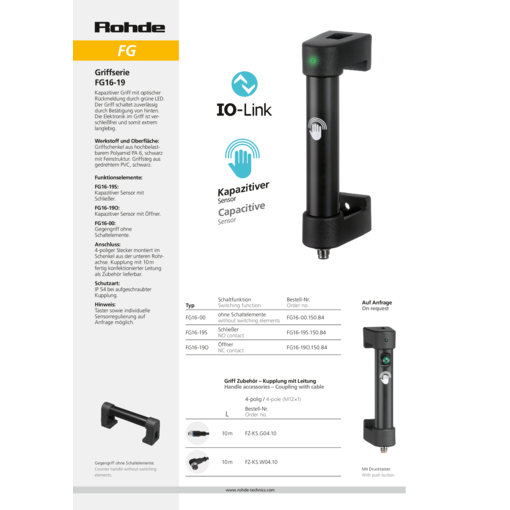 | Producttype FG16-19S | Omschrijving Capacitive sensor (NO contact) | Bestelnummer FG16-19S.150.84 3D+CAD |