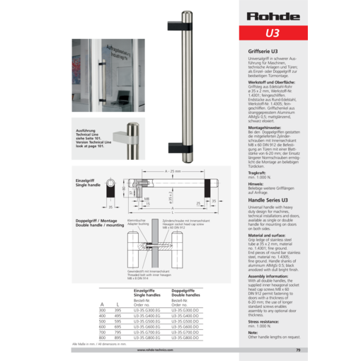 Universele handgreep in zware uitvoering voor machines, technische installaties en deuren; als enkele of dubbele greep voor montage aan beide zijden van de deur.