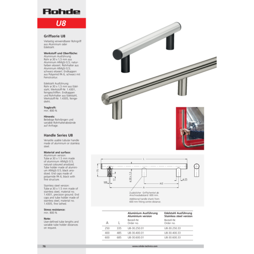 buis ø30x1,5 mm uit aluminium AlMgSi 0,5; in natuurlijke kleuren geanodiseerd. Buishouder uit aluminium AlMgSi 0,5; zwart geanodiseerd. Eindkappen uit polyamide PA6, zwart met fijne structuur.