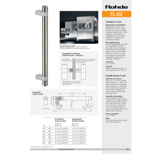 bij de dubbele handgrepen maken de meegeleverde inbusbouten M8x60 DIN 912 bevestiging mogelijk op deuren met een materiaaldikte van 6-20 mm; door gebruik te maken van langere normschroeven is montage op een willekeurige materiaaldikte mogelijk.
