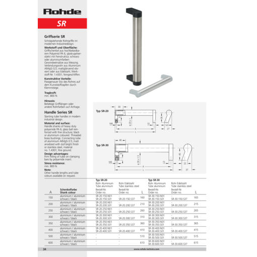 Asas de poliamida extremamente resistente, reforçado com esferas de vidro, ligeiramente estruturado, preto ou cor de alumínio. Encaixes roscados em latão. Tubo de união em alumínio AlMgSi 0,5, anodizado fosco brilhante ou aço inoxidável, nº de material 1.4301, lixado.