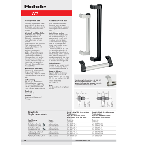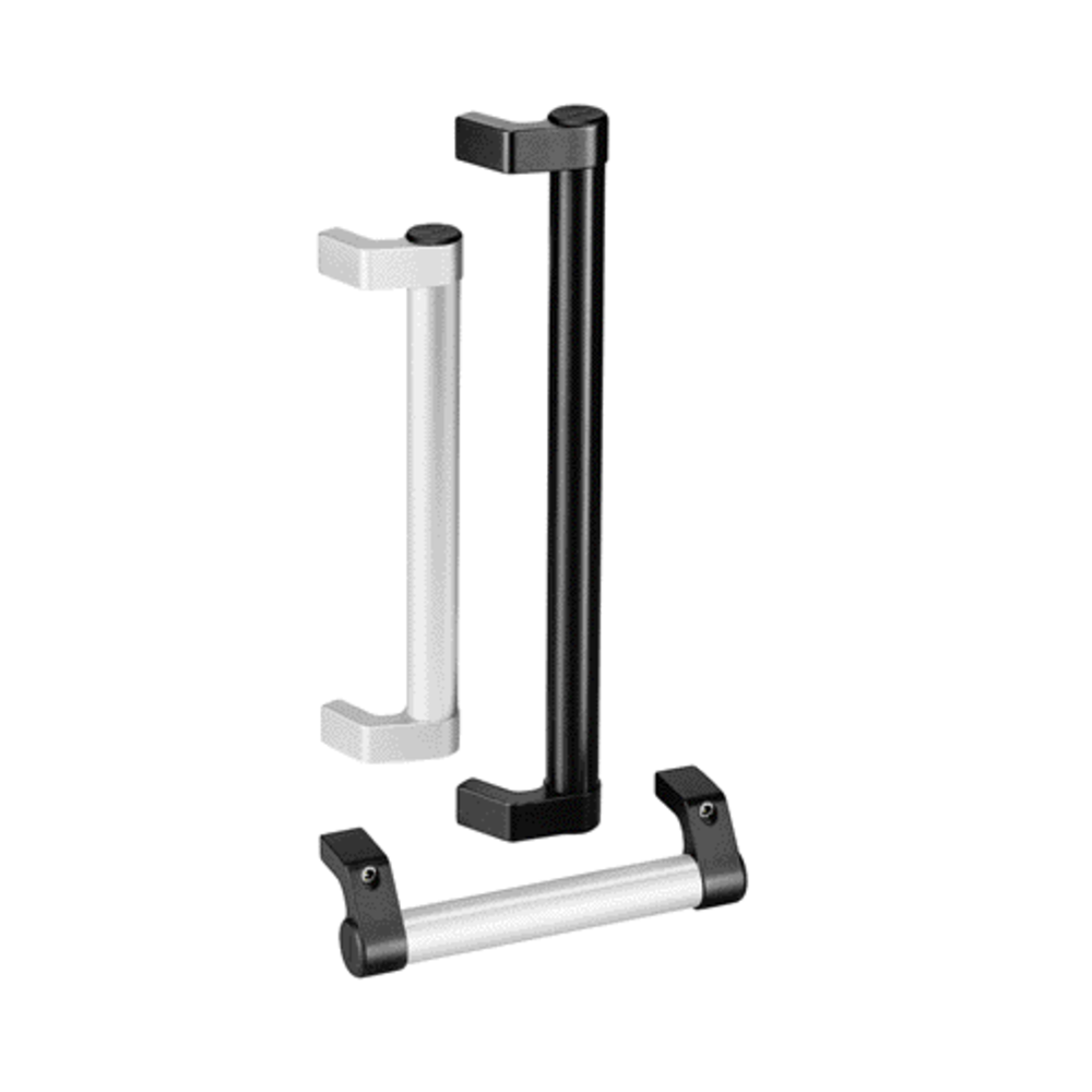 Asas da pega em alumínio prensado AlMgSi 0,5, fosco brilhante, anodizado de cor natural ou em preto. Encaixe de asa em poliamida, reforçado com esferas de vidro, preto, partes visíveis serrilhadas. Tubos de união ø30x1,5 mm em alumínio AlMgSi 0,5, lixados e anodizados em 2 tipos de cor, ou revestidos de plástico preto canelado ou revestidos com pó em preto, serrilhados. Em alternativa, tubo em aço inoxidável lixado.