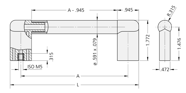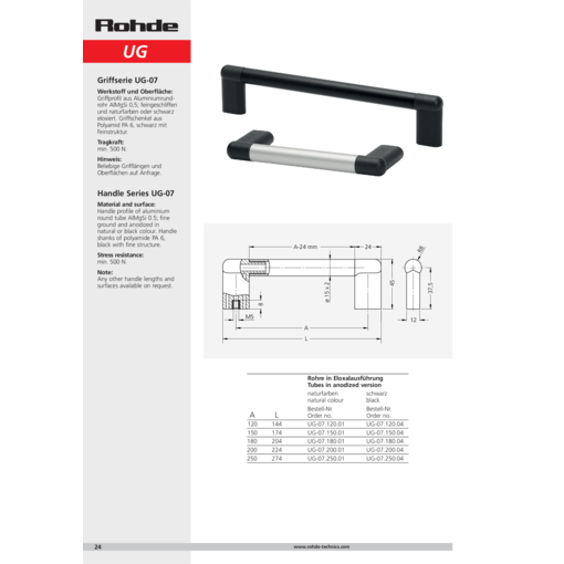 Puxador de perfil de tubo circular em alumínio AlMgSi 0,5; polimento fino e em cores naturais ou preto anodizado. Asas do puxador em poliamida PA6, pretas com estrutura fina.