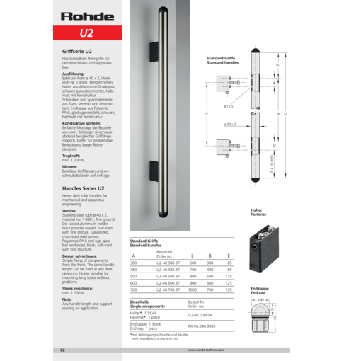 Asal çelik boru ø40x2, Hammadde No. 1.4301, ince zımparalı, tutucu, alüminyum pres dökümden, siyah toz kaplama, ince dokulu yarı-mat. Vidalar ve gergi elemanları, galvanize ve krom kaplı çelikten. Uç başlığı, PA6 malzemeden, cam bilye takviyeli, siyah renkte, ince dokulu yarı-mat.
